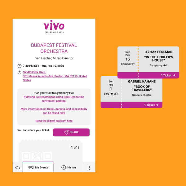 Visit mobile.vivoperformingarts.org from your smartphone or tablet. We recommend starting a new window in Safari or Chrome.